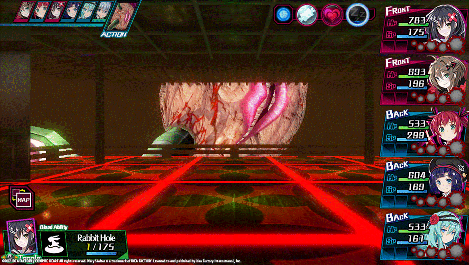 Battles occur through random encounters in Mary Skelter: Nightmares. While running away from the Nightmare, you may bump into the lesser Marchens! Be careful–Nightmares strike even when you’re in battle! Stay calm, remember your training, and end the battle with the Marchens quickly.